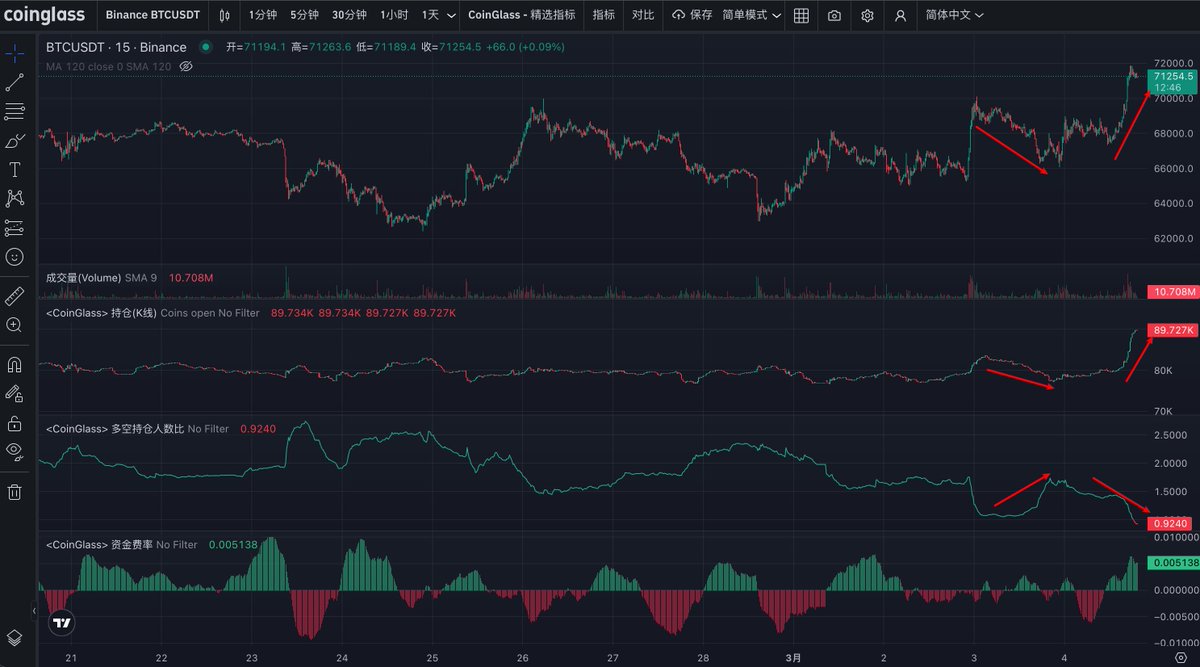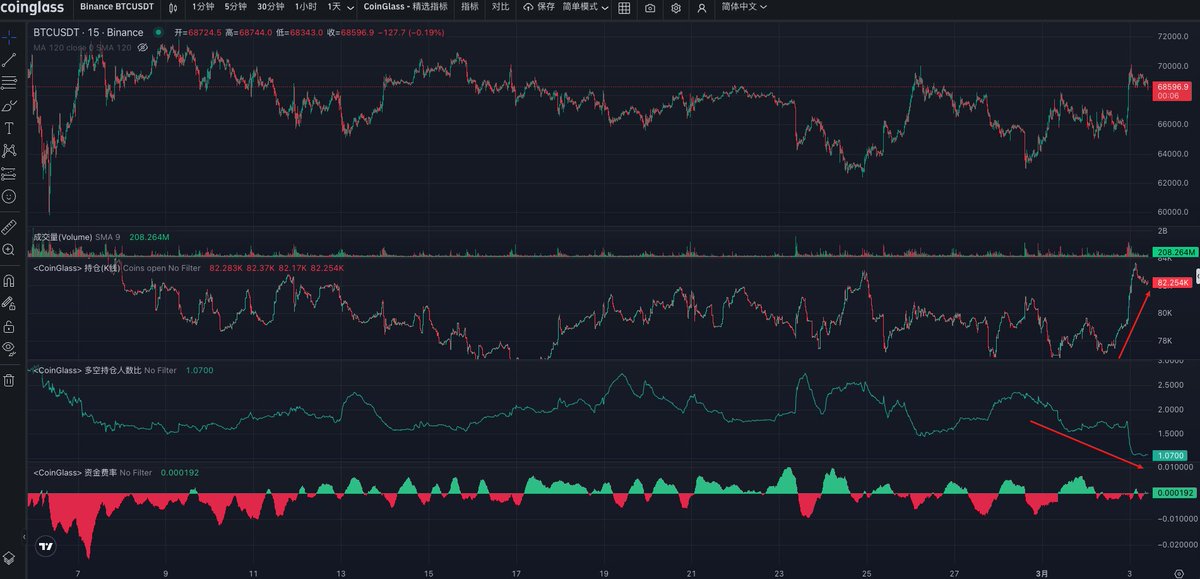 又是一场经典的数据战法,合约持仓大涨意味着场内多空双方大资金进场激烈博弈,此时行情不会持续太久,很快就会选择方向,直到一方投降,投降的标志就是持仓大幅减少;