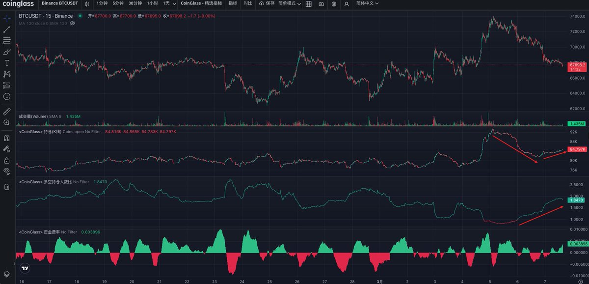 3月7号提示67附近开始止盈震荡空单并转震荡多单后,多头行情一直持续到现在,目前行情陷入横盘整理阶段,分析一波当前的数据指标情况;