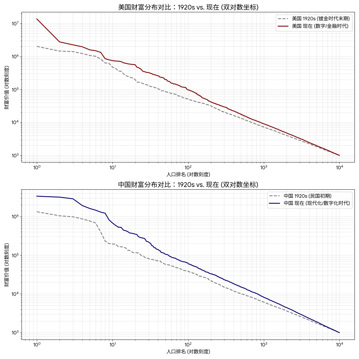 第一组图对比了中美两国1920s与现在的财富分布,双对数坐标下的曲线像一把把残忍的斜坡:
