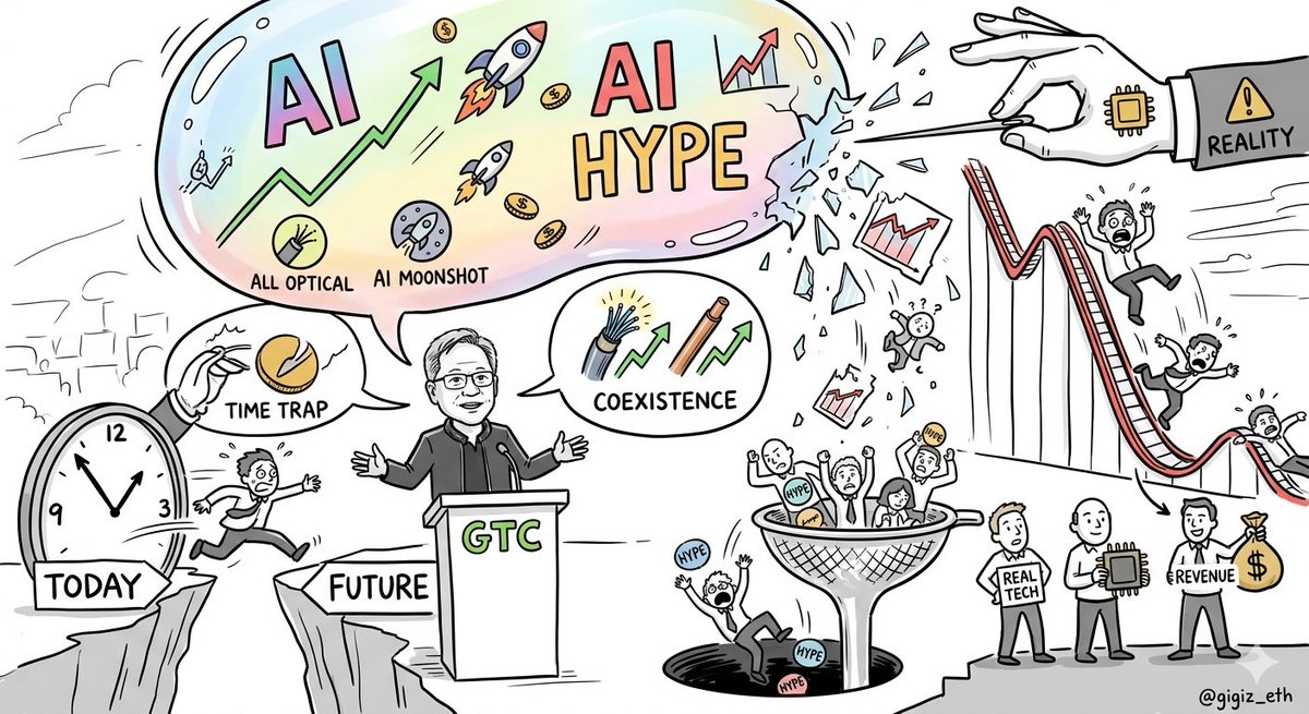 这两天AI板块腥风血雨,英伟达GTC大会刚结束,币圈AI概念币跟着上蹿下跳,美股光通信板块更是惨烈跳水