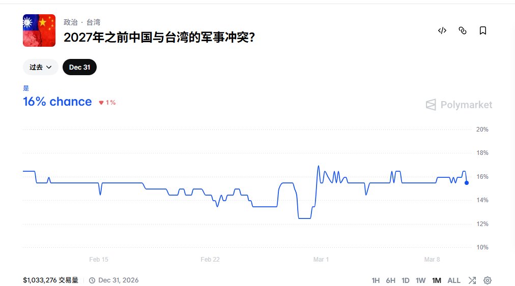 我的认知是,全球所有国家都在下棋,主角是美国。负责好各自的配角,指数需要回调的话,大家就配合战争出来洗盘。但这些国家我认为的是除了中国,朝鲜不在剧本编排中,那么随时可能爆发的台海战争是不可控因素,poly上的预测概率也在27年之前的可能性为16%。所以目前我也在考虑去Poly上押注一些在2027之前台海会发生战争(定投),用来对抗自己的风险。