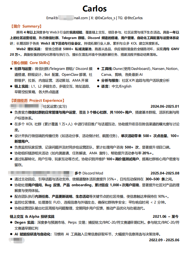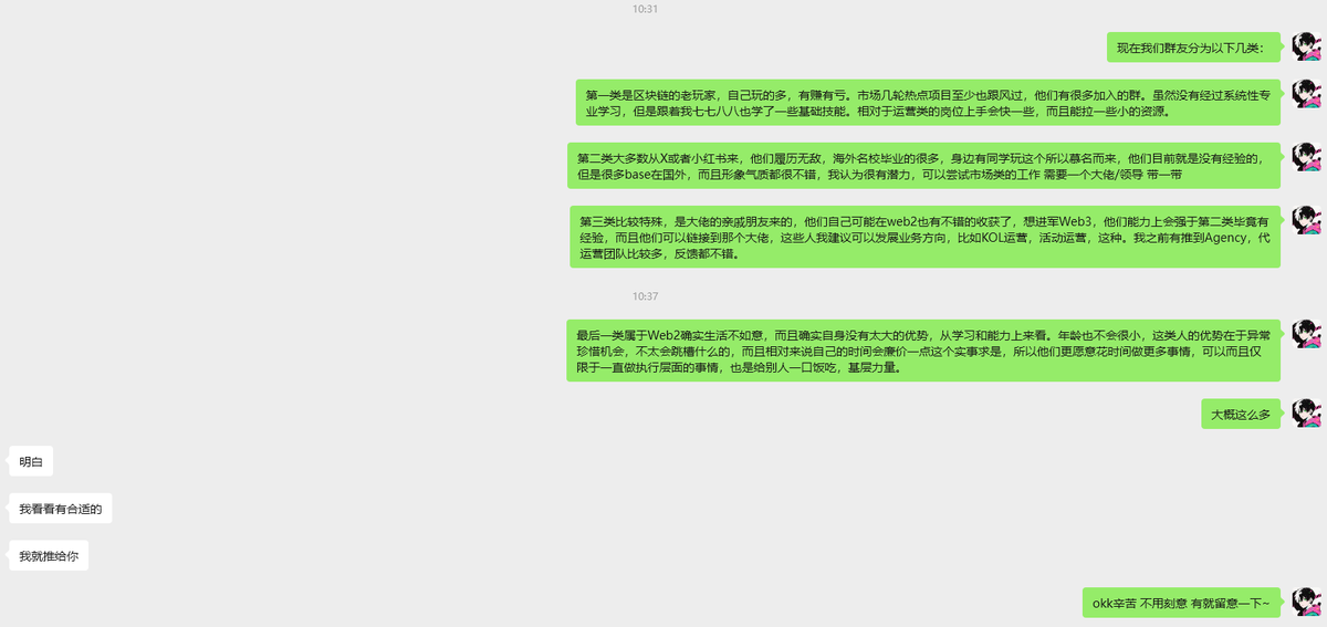 第三件事情:如果可以的话参与一份运营类的工作,那会岗位是很多的,如果找不到,你也可以去一些大KOL社区做mod,或者叫志愿者,免费的那种。一方面有机会认识大佬,一方面可以做做工作。