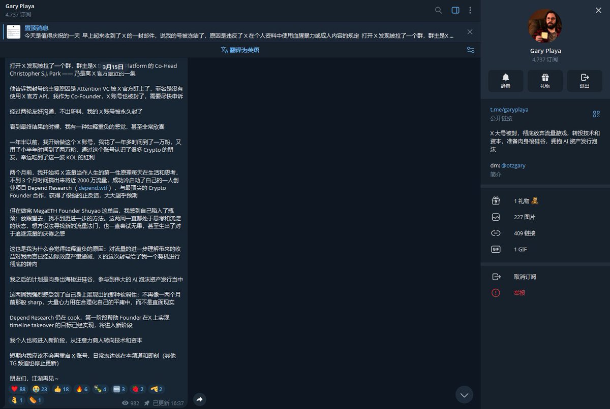 今天看到才发现 Gary 老师的X被永久冻结了,让我想到了去年年底星野大学微信群被封,那会群媒体99999+的聊天量,换到TG之后很多人说热度少了