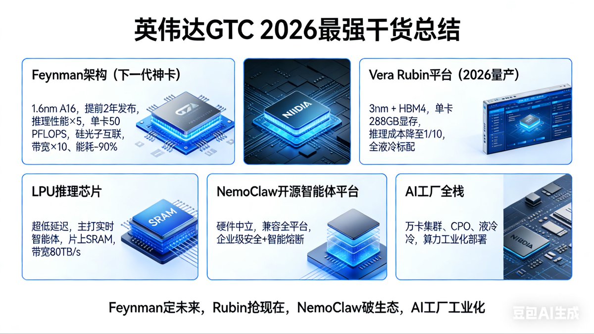 还有个狠活是开源的NemoClaw平台,相当于英伟达版的安卓,不强制你用它家芯片,谁都能用,这步棋太绝了,以前是卖铲子,现在直接给全行业定规矩,大佬都喜欢定规矩……最后还放了个大招,提前2年亮了下一代1.6nm的Feynman架构,连笔记本CPU都下场做了,直接抢Intel和AMD的饭碗。