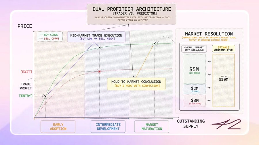 内生流动性(Bonding Curve 机制): 每一个事件可能的结果都被代币化为 OT。通过联合曲线定价,抛弃了对外部做市商的依赖,实现了自我造血的流动性。越早入场,成本越低。