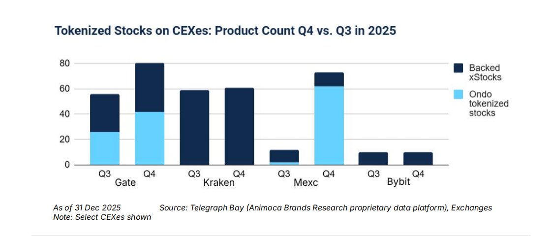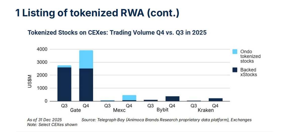 2. 第二个要说到的股权通证化(RWA),Gate的优势非常突出,强大的号召力表现,25年Q4单季交易量49亿美元(日均交易量较第三季度激增11倍)成为全球最大的股权通证化交易平台,直接碾压同行,后面再依托优势稳扎稳打,业绩会更惊人