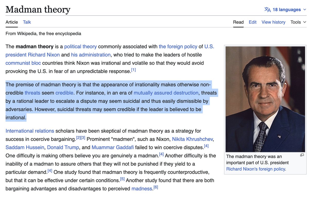 the "Madman Theory" popularized by Nixon is one of the main frameworks of the ongoing conflict between US, Israel, and Iran