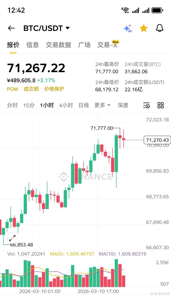 1:#BTC 大饼昨天回踩到了68500附近没下去走了反弹,凌晨慢慢反弹最高到了,71000附近没突破又走了小回踩,低点回踩到了69800附近没下去又反弹到了70500附近磨盘,昨晚直播说过大饼就算回踩短期也只能看到69500-69300,都没回踩到,不过目前看大饼走势71000-72000这里要突破上去也没那么容易,上不去还是会下来79000