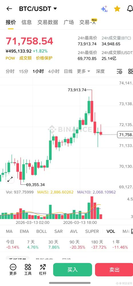 1:#BTC 大饼昨天一波拉到了74000,最低67500上来拉了7500点,74000这里刚好是这波下探跌破位的比较重要的位置,正常情况这里要突破的概率不大,74000-75000都是大压制位,不过目前日内走势是多头形态,日内回踩关注72000,跌不破位就会继续慢慢再往74000附近试探一次,下方支撑71000,70000,先关注这些位置