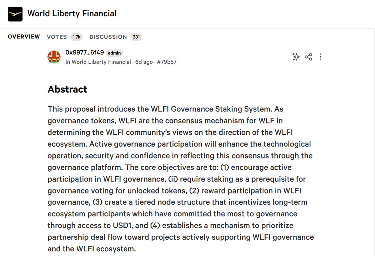 WLFI的治理质押系统提案@worldlibertyfi 13号结束,最后肯定通过,大致讲下里面的内容