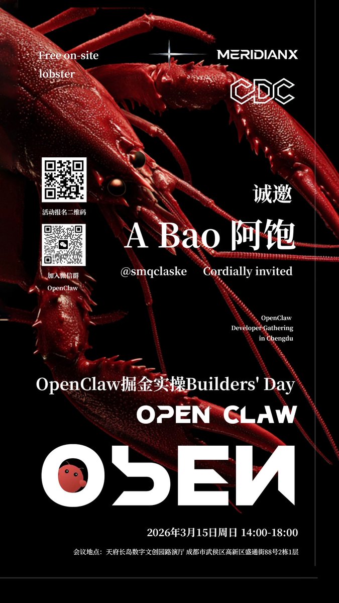 周日,我和 @0xAuFlux 会在成都办一场超级炫酷的 OpenClaw 分享会,于天府长岛,邀请了上百位帅哥、美女、大佬、大咖,有开发者、KOL、媒体、交易所,也有传统金融和 AI 行业的精英