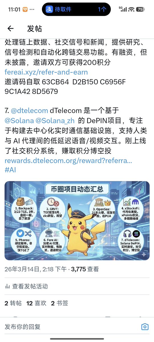 1.@Backpack 3月23日tge,3年了,你知道这三年我怎么过的嘛,盘前这个价格不是很好,打算到时候多多少少卖了去旅游@Solana @Solana_zh