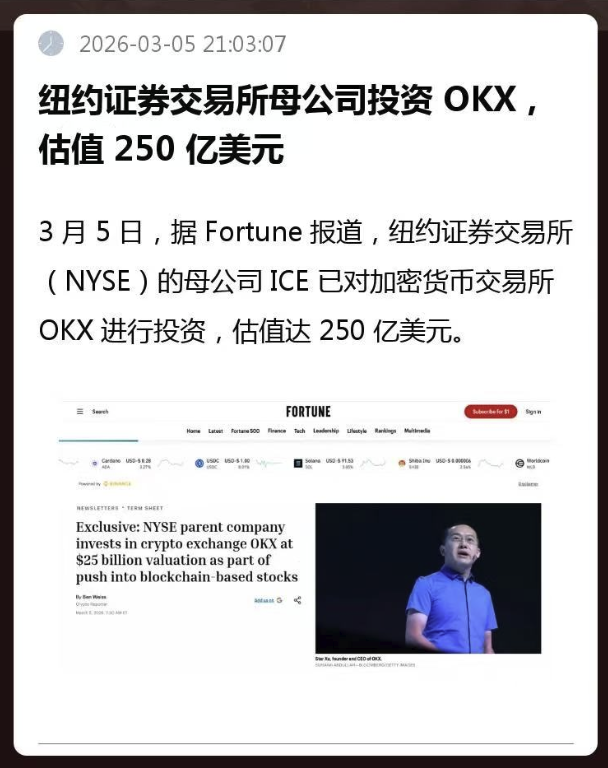 原来就在刚刚 OKX 宣布了和 ICE(洲际交易所,纽交所NYSE的母公司)的重磅合作,不仅拿了投资,ICE还直接进了董事会。