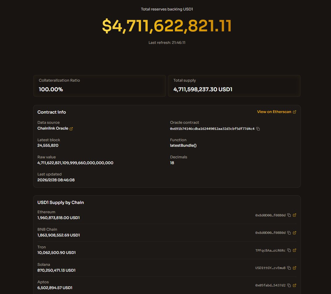 经过了前几天的Fud 脱锚事件后,WLFI @worldlibertyfi 的 USD1 稳定币迎来重大透明度升级:现已实现实时、链上储备证明。👏