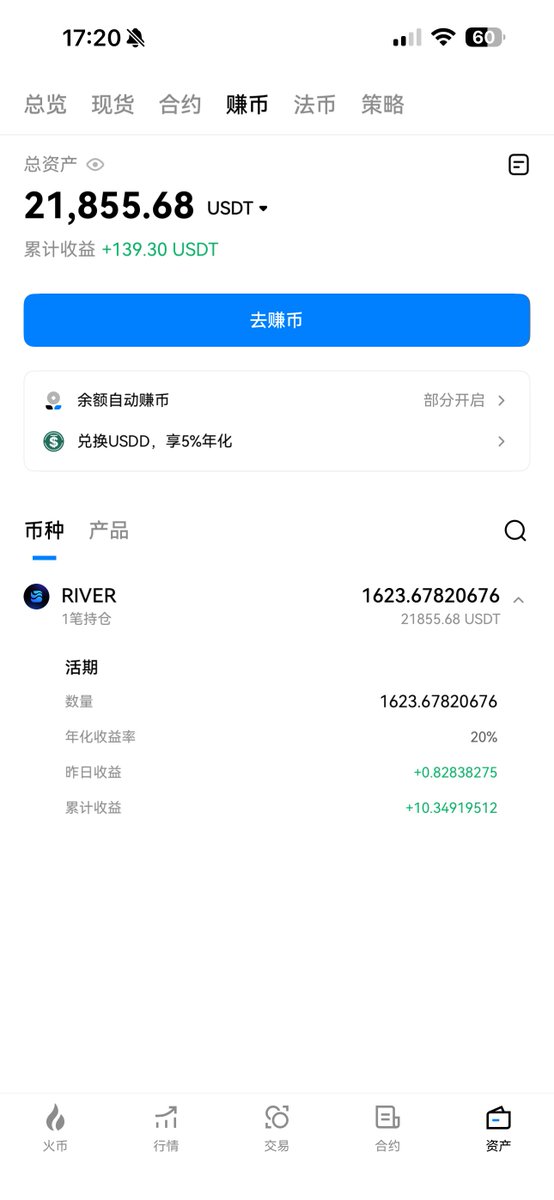 放火币理财20%的年化,已经收益23个多币,而且币价翻倍24u了,一个月爽吃570u利息。