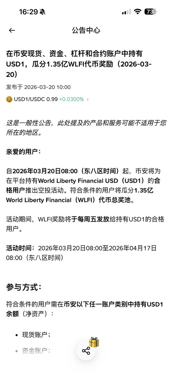 3.20-4.17 在币安 #binance 的现货、资金、杠杆、合约账户中持有USD1可拿到空投,其中在合约和杠杆账户中可以享受1.2倍加成。跟之前的USD1理财一样 。 @binancezh