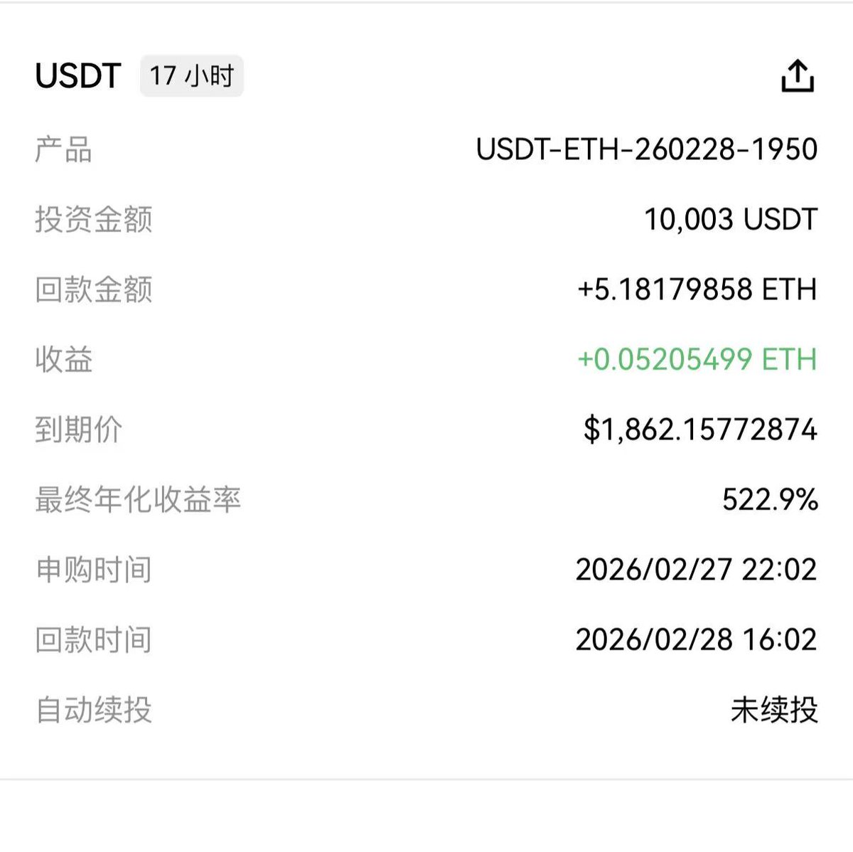 第二天结算的时候,ETH价格:$1862,理论上我投的1万刀会变成 10000➗1950=5.1282 ETH,但是双币赢有利息,最终给了我 5.1817 ETH,多了0.06ETH,大概112刀。