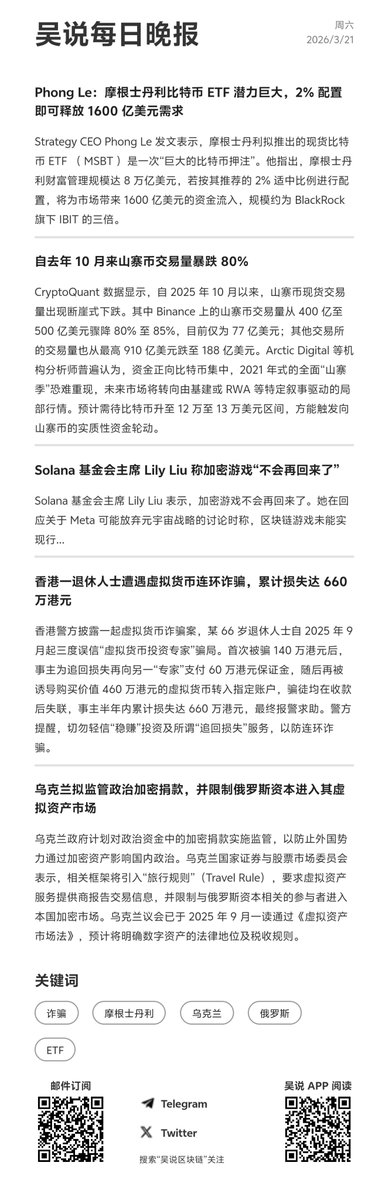 吴说获悉,Strategy CEO Phong Le 发文表示,摩根士丹利拟推出的现货比特币 ETF ( MSBT )是一次“巨大的比特币押注”。他指出,摩根士丹利财富管理规模达 8 万亿美元,若按其推荐的 2% 适中比例进行配置,将为市场带来 1600 亿美元的资金流入,规模约为 BlackRock 旗下 IBIT 的三倍。