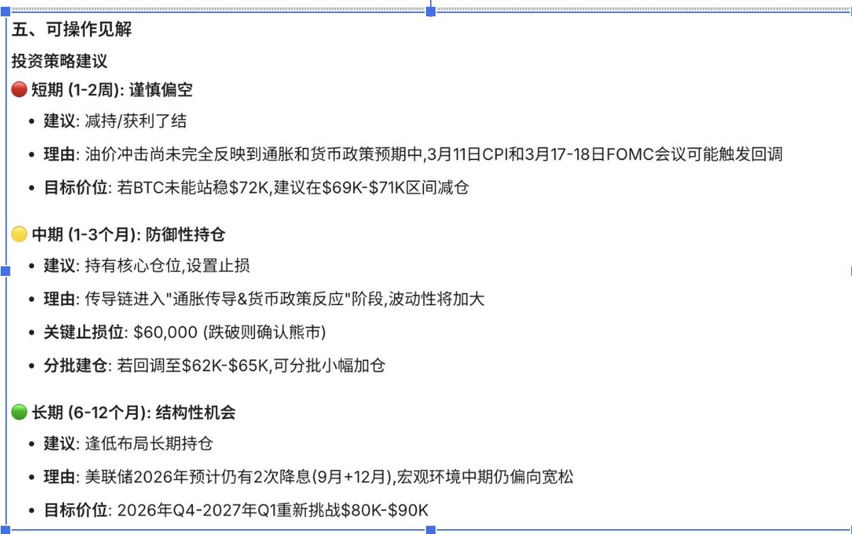 然后从输出结果来看,总体非常完整(图 3),包括 7 大章节和可操作的短期/中期/长期投资策略,核心观点也被验证是对的(比特币在短暂上涨后开始下跌 )