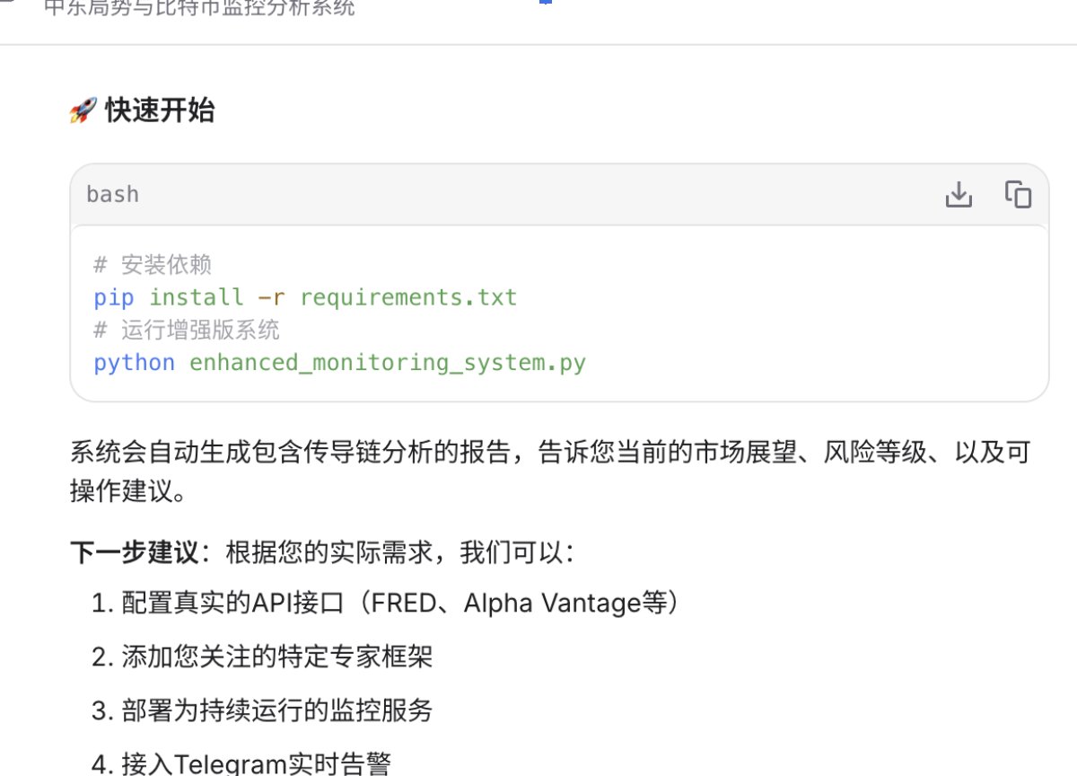 「我想知道中东局势,美国和伊朗最新的动态,以及比特币跟这些动态的相关性。请你帮我设计一个监控方案,可以监控主要海外媒体(包括美国和伊朗两方面的官方媒体和社交媒体)、实时政治动态的KOL、预测市场(polymarket)关于伊朗局势相关话题等;并且同步监控比特币价格动态变化。」