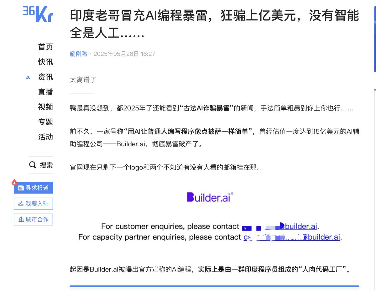 之前有个挺搞笑的事,说是一个做 AI 编程的项目,demo 特别强,还融了不少钱,后来被扒出来其实是印度外包在后台古法写代码……