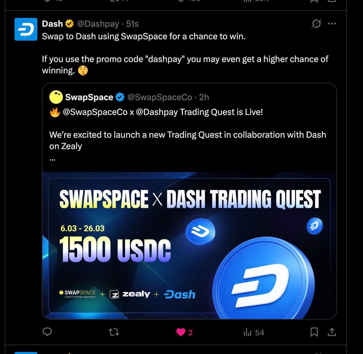 兄弟们,撸这个 @SwapSpaceCo 和 @Dashpay 联合举办的活动,奖池有 1500 USDC。
