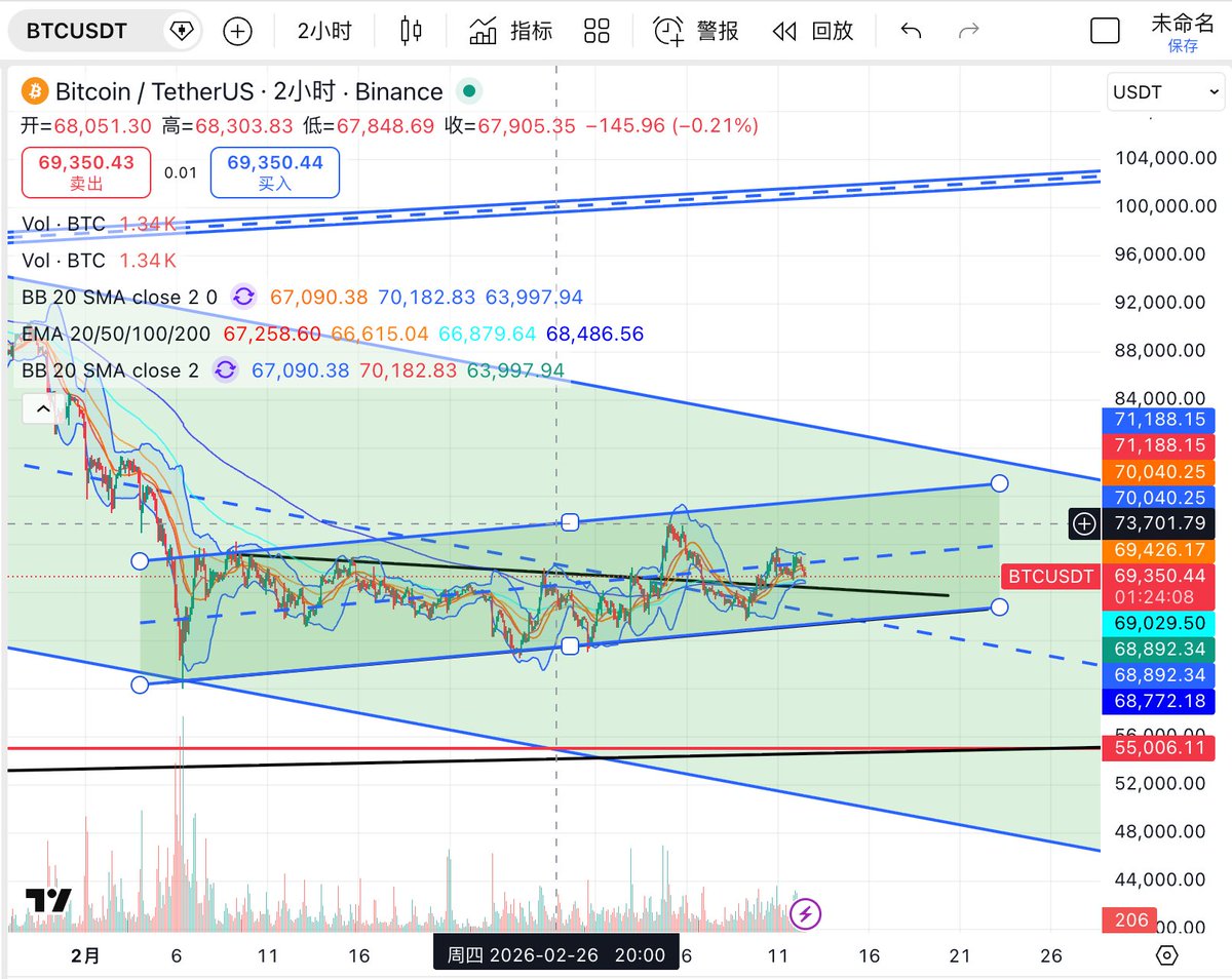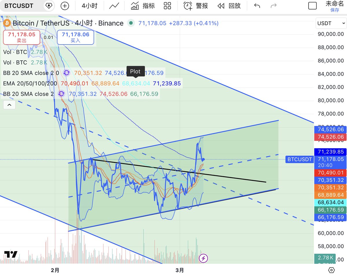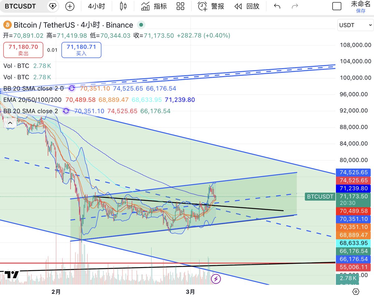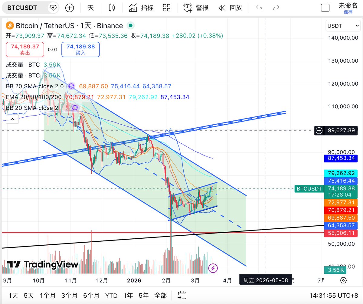 #BTC 仍是本轮市场方向判断的核心变量,日线图上,BTC 自前期快速下跌后,在大级别下降通道下沿附近形成阶段低点,随后展开一轮结构性修复。当前价格回升至 74000 ,并已重新站上 BB20 中轨(约 70000) 以及 EMA20(约 70900),同时向 布林上轨 75500 发起试探。说明短线资金回流是真实存在的,市场已从单边杀跌切换到反弹主导的节奏中。