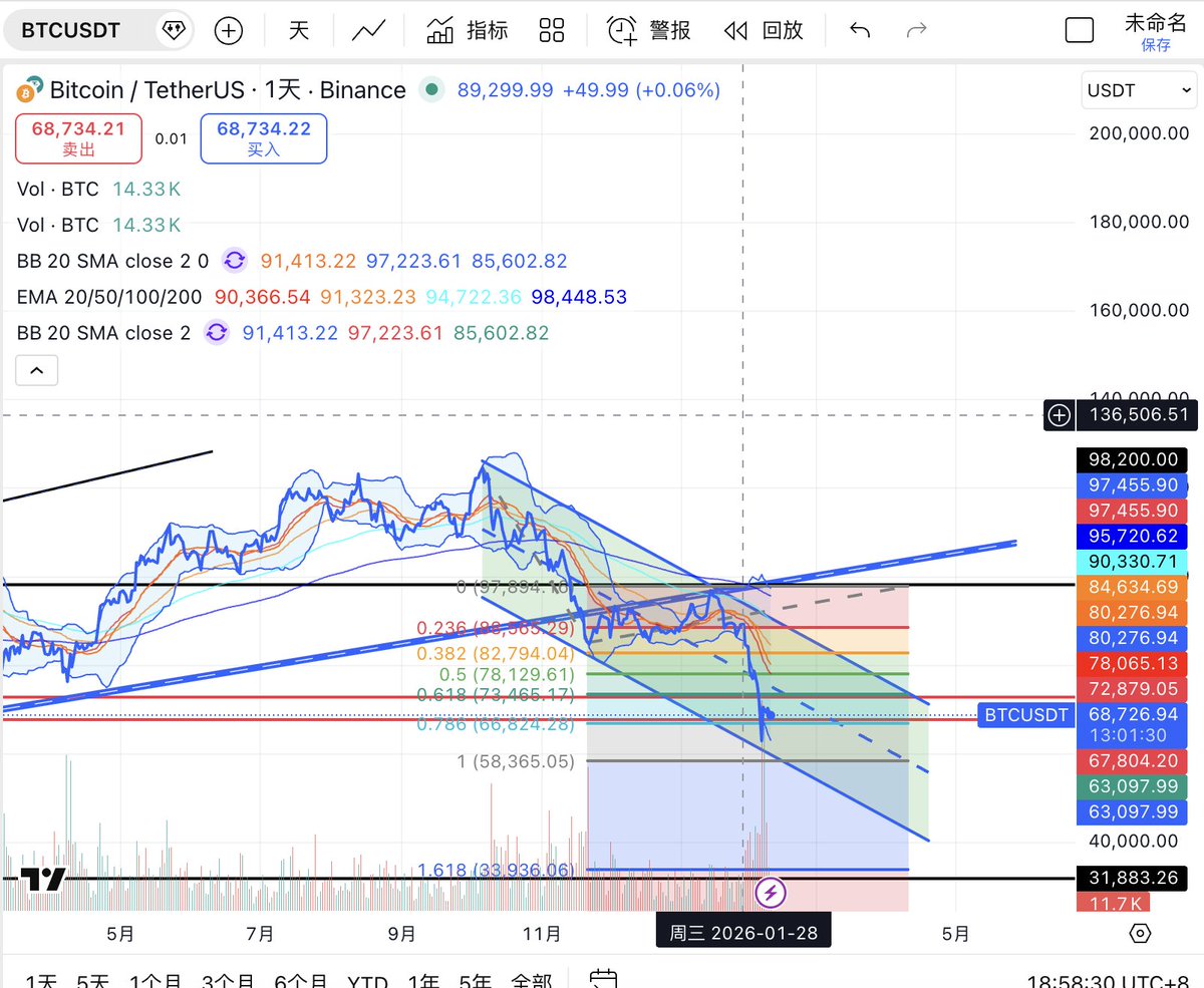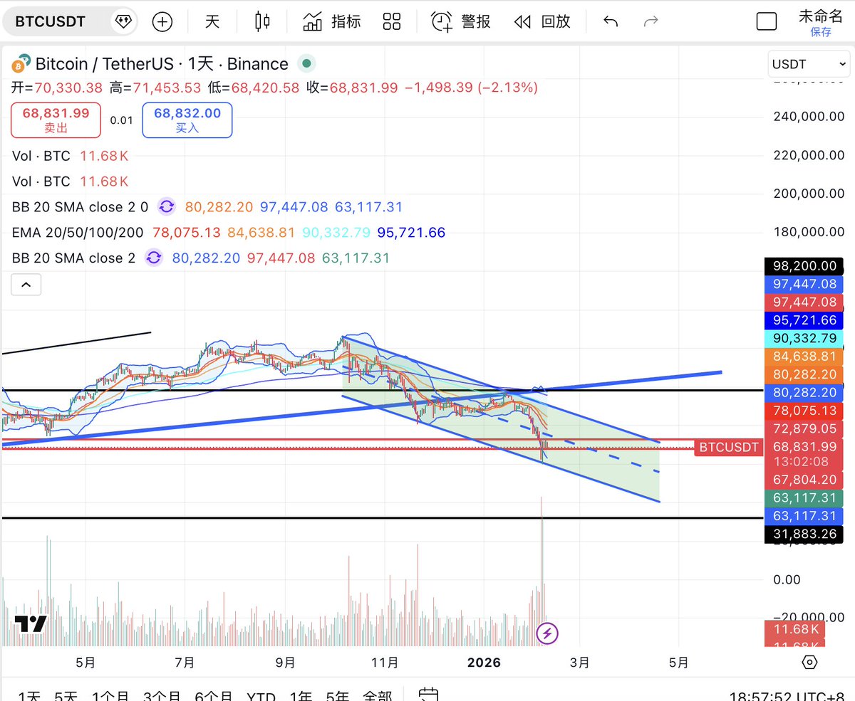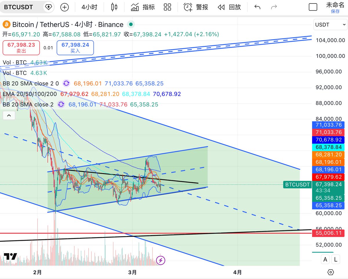 #BTC 仍是本轮市场方向判断的核心变量,日线图上,BTC 自前期快速下跌后,在大级别下降通道下沿附近形成阶段低点,随后展开一轮结构性修复。当前价格回升至 74000 ,并已重新站上 BB20 中轨(约 70000) 以及 EMA20(约 70900),同时向 布林上轨 75500 发起试探。说明短线资金回流是真实存在的,市场已从单边杀跌切换到反弹主导的节奏中。