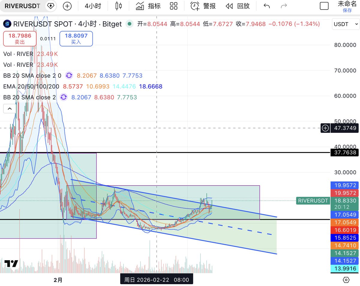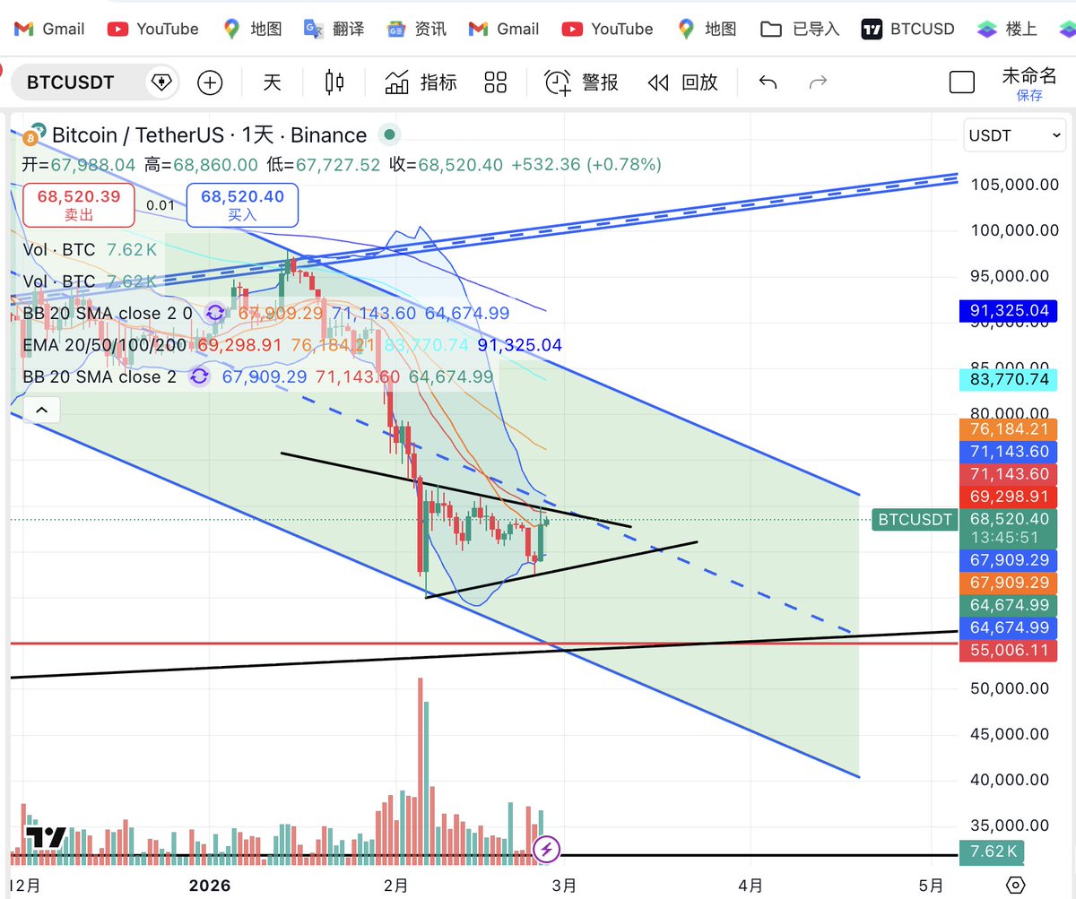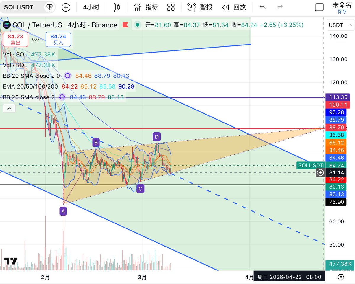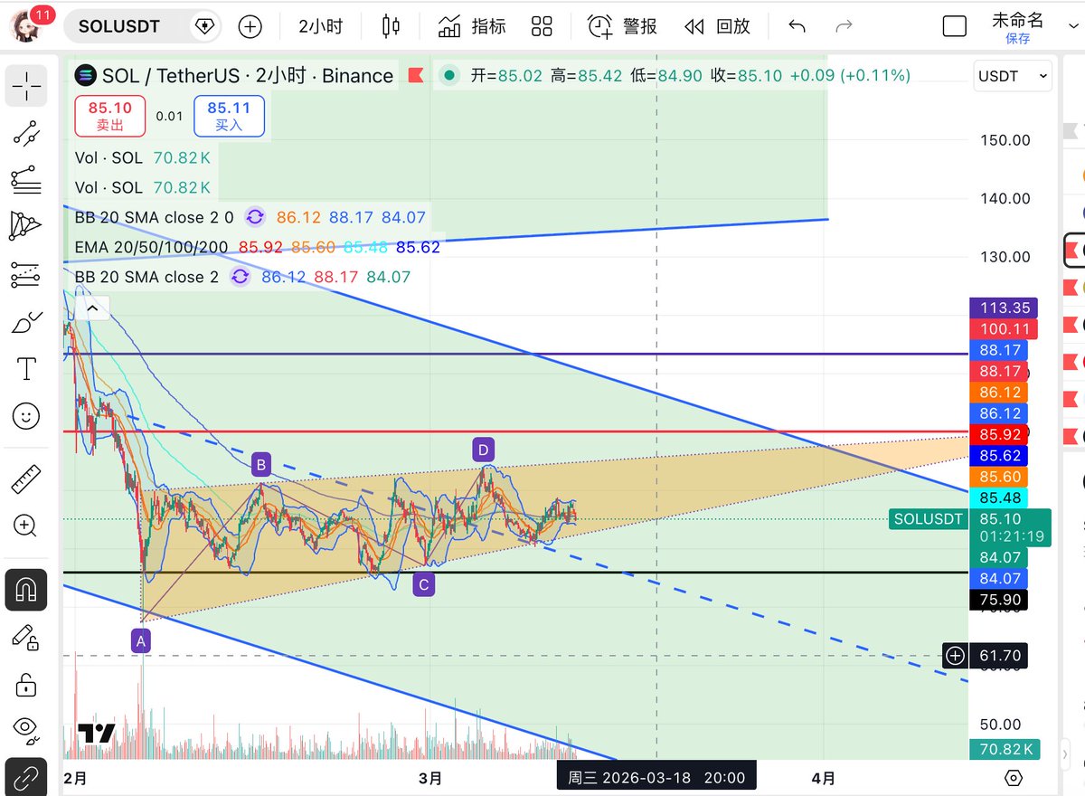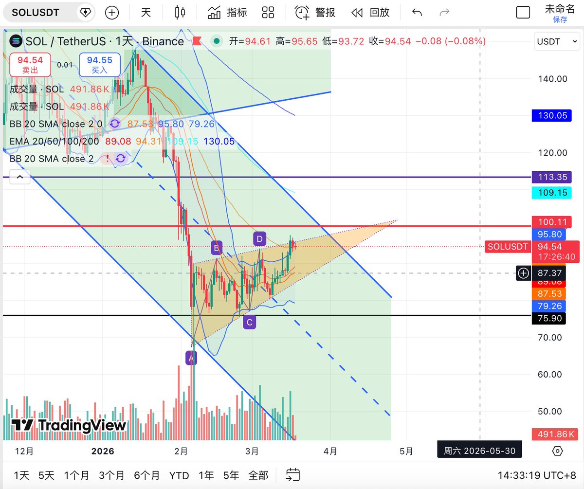 另外 #SOL 是当前结构上最具交易弹性的品种。从日线图看,SOL 在前期急跌后并未出现持续性阴跌,而是逐步构建出一个较明确的 收敛三角形/楔形整理结构。当前价格位于 94.5 附近,已经逼近上方关键压力 95.8—100 区域,同时也重新站回 EMA20(89.1) 与 EMA50(94.3) 附近。布林中轨在 87.5 一线,说明价格已经明显脱离弱势区,并进入偏强修复区域。