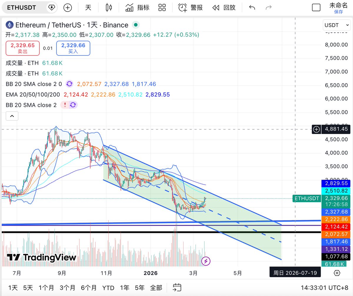 #ETH 当前更像是一个 跟随 BTC 修复、但自身独立强度不足 的状态。其短线弹性存在,但上方每一个区间都面临套牢盘与均线压制的双重供给。如果 BTC 不能进一步突破,ETH 在 2,320—2,500 区域大概率会呈现更明显的震荡消化特征。因此,ETH 后续的判断重点不在于短线是否还能上冲,而在于能否把 2,220—2,300 区域 转化为有效支撑。若能保持在该区间上方横向整理,则说明修复结构稳固,后续仍有机会向 2,500 甚至更高位置推进;若重新跌破 2,220,则反弹级别将被削弱,走势可能重新回到偏弱整理框架中。