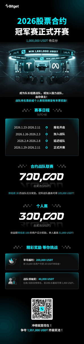 美股财报季,#Bitget 股票合约冠军赛一起冲! 玩了7-8年的美股,说实话,每年1月和2月都是我们做美股套利最兴奋的时刻。七朵金花和蓝筹股,如Meta、苹果、亚马逊扎堆放财报,一天上下5%—10%是家常便饭。这种行情,往往需要快速获取投行评估,确定性中开一定杠杠,获得套利和对冲的收益。 这次我决定在 #Bitget 的股票合约赛里试一把,凑凑热闹的同时,他们这几个点确实戳中了我实战的痛点: 1️⃣跨市场对冲,终于不用反复切App了 以前美股是美股,币圈是币圈。但现在行情联动起来了,美联储一开口或者地缘政治动荡,两边一起颤抖;财报季,英伟达一涨,AI叙事启动。 在#Bitget 平台上,我能一边做多 NVDA 赌财报超预期,一边挂 BTC 合约对冲宏观风险。一个界面解决所有对冲逻辑,这种效率在财报季这种“读秒”行情里太重要。 2️⃣最高25倍杠杆,不是去赌,而是提高资金效率 很多人担心杠杆,主要是怕用错。美股财报季的特点是,时间短、波幅大、逻辑强。 如果我判断某只股有8%的确定性波动,配合止损,用5-10倍杠杆快进快出,资金利用率比死拿现货高得多。而且算准赔率情况下,也是不错的精准打击。 3️⃣高额的奖金,不拿白不拿 个人赛: 凭本事吃饭,前100名分30万U。 团队赛: 几个哥们组个5人小队,可以冲那70万U的主奖池。 任务奖: 每天做几笔交易还能开宝箱,给点 $TSLA 或 $AAPL 的代币化股票,这基本就是平台送钱给你去练练手。 4️⃣赶紧入场,加入战队,还有12天倒计时! 目前活动已经开始,截止到2月11日。接下来苹果,谷歌,亚马逊都是重头戏。现在的排名都是暂时的,只要抓住一波爆发,分分钟冲进前100,参与地址,👇放在评论区了! 总结来说,咱们本来就要做财报季交易,目前 #Bitget 平台有奖金、有工具、手续费还低,纯属福利大赠送。波动就是子弹,平台就是枪,现在火药味最浓,该扣扳机了。👉战队还差两个位置,来懂行的兄弟,咱们一起去分那70万U!想进的评论区吼一声!