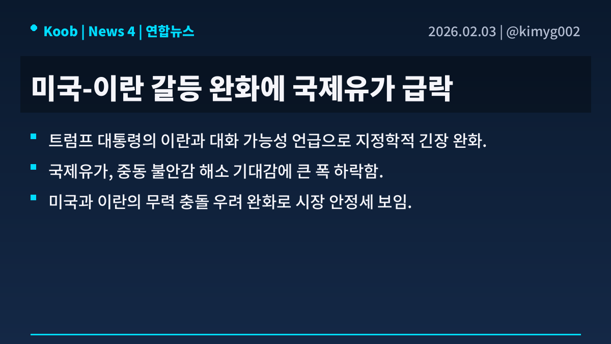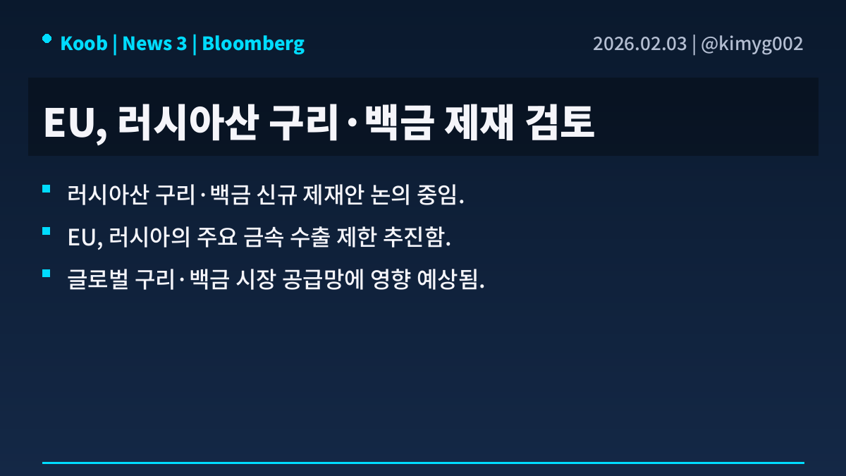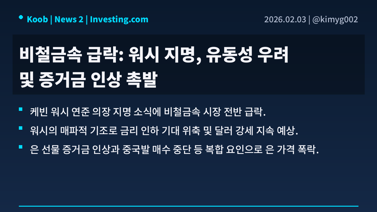 📅 02월 03일 (화) 00:27 기준 | 주요 소식 정리 1️⃣ 케빈 워시 연준 의장 지명 속 강달러 전환 • 케빈 워시의 연준 의장 지명 가능성 소화 속 그의 매파적 성향에 대한 평가가 글로벌 증시의 위험 선호 심리 약화로 이어지는 양상. 특히 워시가 인플레이션 억제 및 연준의 양적 완화 정책에 반대해온 입장이 달러 강세 전환과 금리 민감도가 높은 기술주 및 중소형주의 약세를 유발하는 배경. • 국내 증시 혼조세 및 주요 경제 지표 영향 • 전주 금요일 국내 증시는 외국인의 코스피와 코스닥 시장 현선 동반 순매도 속 혼조세로 마감한 상황. 코스피200 지수 선물은 한때 사상 처음으로 780선을 돌파했으나 이후 외국인 매도 전환으로 상승분을 대부분 반납함. 한편, 12월 PPI 지표가 예상치를 상회하며 인플레이션 압력이 부상한 점 또한 증시에 부정적으로 작용. • 글로벌 위험 선호 약화 및 추가 하방 압력 • 워시의 연준 의장 지명 소화와 기술주 투심 약화로 금일 지수 선물은 하락 우위 보일 전망. 주말간 엔비디아의 오픈AI 투자 규모 불확실성 보도 및 미 정부 셧다운 돌입 우려가 추가적인 하방 압력으로 작용할 가능성. • 관련 섹터 및 자산: 기술주, 중소형주, 반도체, 귀금속, 달러 2️⃣ 비철금속 시장 급변동 배경 및 영향 분석 • 케빈 워시 전 연준 이사의 의장 지명 소식은 시장에 매파적 인사로 인식되며 금리 인하 기대 위축. 워시의 양적 완화 비판 및 대차대조표 축소 강조 기조는 실질적 긴축 효과와 달러 강세 지속 가능성 시사함. 이는 당초 예상보다 늦춰지거나 축소될 수 있는 금리 인하 폭에 대한 우려를 증폭시키는 배경이 됨. • 지난 금요일 은 가격은 -31.4% 급락하였으며, 금(-11.4%), 백금(-19%), 팔라듐(-15%) 등 귀금속 전반 동반 하락함. 중국 UBS SDIC Silver Futures Fund의 거래 중단으로 중국발 은 매수 자금 유입이 중단되었고, COMEX의 가격 고정 방식 변경으로 변동성 취약성이 증가함. CME의 은 선물 증거금은 9%에서 11%, 다시 15%로 인상되어 개인 매수자의 대규모 매도를 촉발하며 급락세를 심화시킴. • 은 가격 급등은 반도체, 태양광 등 산업 생산에 심각한 차질을 초래하며 산업적 손실을 야기할 우려. 귀금속 가격 상승은 탈달러 및 기축통화 지위 위협으로 해석될 수 있어 JP Morgan 등 금융기관의 개입 명분을 제공함. CME의 증거금 인상 조치가 시장 변동성 완화가 아닌 오히려 급등락 트리거로 작용하며 시장 불안정성을 심화시킴. • Related Sectors/Assets: 귀금속, 비철금속, 반도체, 태양광, 달러, 통화정책 3️⃣ EU 러시아산 구리·백금 신규 제재 논의 분석 • 러시아-우크라이나 전쟁 장기화에 따라 EU는 러시아의 전쟁 자금 조달 능력을 약화시키기 위한 추가 제재를 지속적으로 모색하는 중임. 기존 에너지 부문 제재에 이어, 이제는 러시아의 주요 수출 품목인 산업용 금속으로 제재 범위를 확대하려는 움직임을 보이고 있음. 이는 러시아 경제에 더 광범위한 압박을 가하려는 의도로 풀이됨. • EU는 러시아산 구리와 백금에 대한 수입 금지 조치를 포함하는 새로운 제재 패키지를 고려하고 있는 것으로 알려짐. 러시아는 세계 구리 및 백금 시장에서 중요한 생산자 중 하나로, 이러한 제재가 시행될 경우 글로벌 공급망에 상당한 영향을 미칠 것으로 예상됨. 특히 백금은 자동차 촉매 변환 장치에 필수적인 광물임. • 러시아산 구리와 백금에 대한 EU의 제재가 현실화될 경우, 글로벌 시장에서 해당 금속들의 가격 변동성이 크게 확대될 전망임. 자동차, 전자제품 등 해당 금속에 의존하는 산업들은 대체 공급처를 찾거나 생산 비용 증가에 직면할 수 있으며, 이는 전반적인 인플레이션 압력으로 이어질 가능성이 있음. • Related Sectors/Assets: 비철금속, 자동차, 귀금속, 원자재 선물시장 4️⃣ 미국-이란 긴장 완화, 국제유가 5% 급락 분석 • 미국과 이란 간의 고조되던 무력 충돌 긴장이 완화 조짐을 보이고 있음. 이는 최근 도널드 트럼프 미국 대통령이 이란과의 대화 가능성을 언급한 데 따른 것임. 중동 지역의 지정학적 불안감이 해소될 것이라는 기대감이 형성되는 상황임. • 국제유가는 이러한 긴장 완화 소식에 5% 가량 큰 폭으로 하락하였음. 이는 통상 중동 지역 불안정 심화 시 유가 상승 압력으로 작용하는 것과는 대조적인 반응임. 주요 산유국인 이란을 둘러싼 불확실성이 감소하며 공급 차질 우려가 줄어든 결과임. • 국제유가 하락은 에너지 비용 부담 완화로 이어져 글로벌 경제에 긍정적 영향을 미칠 수 있음. 단기적으로 시장의 변동성이 확대될 수 있으나, 장기적으로는 유가 안정화에 기여할 것으로 전망됨. 향후 미국과 이란 간 실질적인 대화 진전 여부가 유가 흐름의 주요 변수가 될 것임. • Related Sectors/Assets: 에너지 산업, 항공운송 산업, 화학 산업, 국제유가 선물 출처 : 블룸버그, 연합뉴스, 인베스팅닷컴 #미국주식 #속보 #경제 $BLK $000660 $UBS $PLTR $JPM $Vanguard $AAPL $NVDA $TSLA