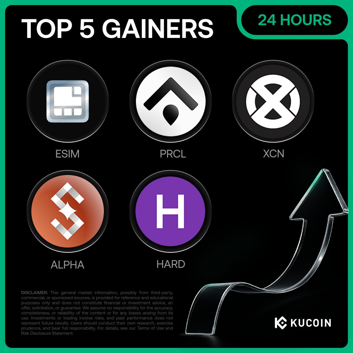 🚀 24H Top 5 Gainers on #KuCoin (January 06, 2026) 1. $ESIM (@depinsim) - $0.12 (+204%) 2. $PRCL (@Parcl) - $0.039 (+78%) 3. $XCN (@Onyx) - $0.0089 (+47%) 4. $ALPHA (@stellaxyz_) - $0.0082 (+46%) 5. $HARD (@hard_protocol) - $0.0038 (+44%) Check Out Today's Top Crypto Gainers on KuCoin! 🔗https://t.co/NvKuFwxskH #Ku24hour