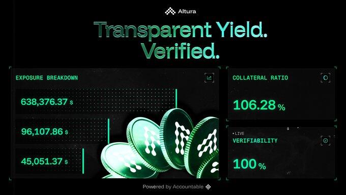信任层面,Altura通过 @AccountableData 实现了全流程实时透明度,这也是它区别于多数高年化协议的核心亮点。用户能随时查看协议储备、抵押率、策略分配及策略现金流等关键数据,搭配机构级验证能力,彻底摆脱了传统高收益协议不透明、仅依赖代币发行的弊端。这种公开可查的机制,为参与方构建了扎实的信任基础,也让其在同类项目中建立了独特的可信度壁垒。