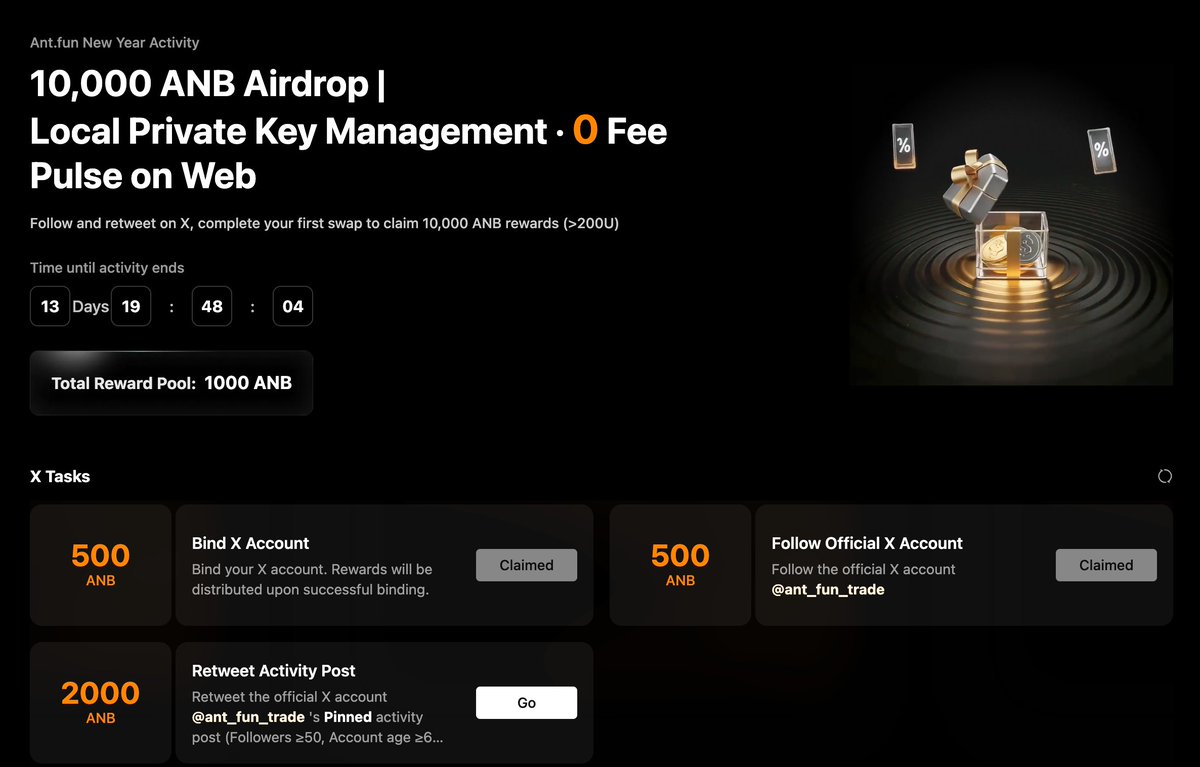 X 最近特别割裂。一边是 meme 天天飞,一边是各种“大毛”活动刷屏,点进去不是规则绕三圈,但就是最后一句“感谢参与”。搞到后面,我对“人均几百U”这几个字已经免疫了。 后来是无聊翻 Solana 项目,顺手点进了 https://t.co/dxyKENe3H6。 本来没期待,就想看看能不能三分钟看懂。结果反而是那种少见的感觉——能拿多少写得清清楚楚,任务做不做你自己决定,手续费还直接免了 https://t.co/dxyKENe3H6 是 Solana 上的 Social DEX 项目 @ant_fun_trade,新年在做免手续费激励,不是抽奖那套,而是交易 + X 社交任务直接给币。我自己算过账,人均 200U 左右,上限更高,打 meme 顺手撸毛,一鱼两吃。 这个活动优点是规则直,不绕;Web 端 0 手续费,操作几乎没成本;本地钱包自托管,私钥在自己手里。奖励是 $ANB ,目前价格约 0.0199U,单人最多能拿 10,000 ANB,值不值一眼就能算明白,努力就行不用靠运气。 参与方式也很简单。 打开 👉https://t.co/vDnrgc0a3y 连 Solana 钱包,先做 X 社交任务就能拿 1000 ANB(≈20U),再跑一笔交易继续解锁奖励,有资源的拉人加速。15 天活动,不复杂。在意私钥和成本的,自己用一次,大概就懂我为啥愿意把它跑完了