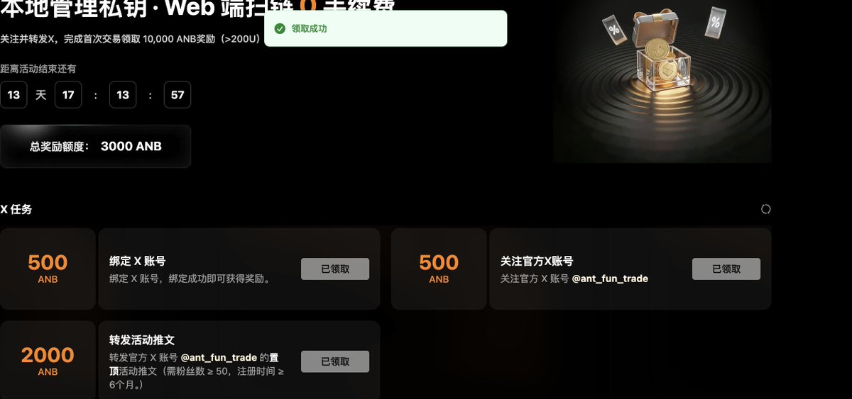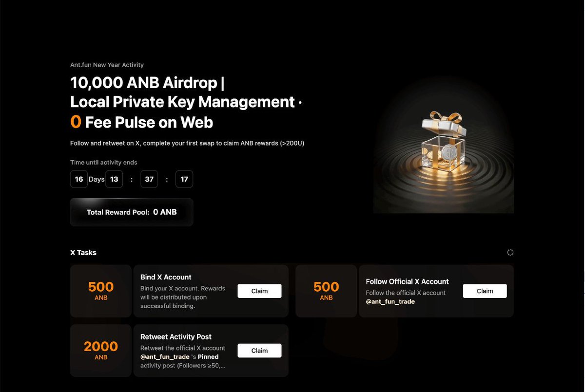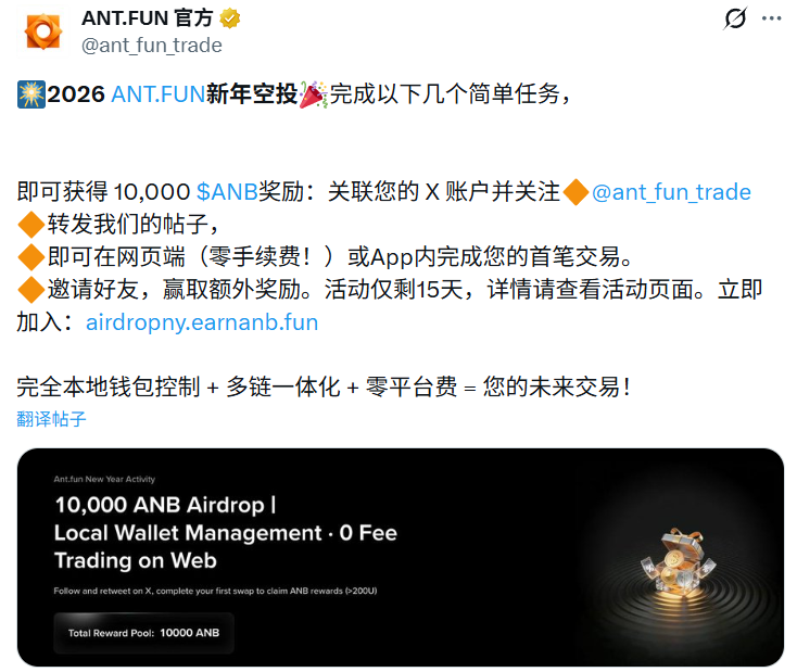 作为经常撸空投的老玩家,今天给大家实测 https://t.co/qCi7XXugon的新年活动——结论先放这:规则清晰、安全有保障、奖励门槛低,新年想稳薅羊毛的闭眼冲。 核心亮点拆解: 1. 活动逻辑透明:无抽奖、无复杂积分,纯任务制,完成X账户绑定+关注官推@ant_fun_trade 转发+首笔交易(Web端0手续费)+邀请好友,就能解锁最高10000 $ANB (约200U),奖励上限明确,不用瞎忙活。 2. 安全无隐患:本地钱包自托管模式,私钥完全由用户掌控,平台无权操作,从根源上避免资产风险,这是我愿意长期用的关键。 3. 成本极低:Web端交易0手续费,对低频操作、扫链用户友好,省下来的手续费就是纯利润,交易流畅度也在线,无卡顿延迟。 4. 背景靠谱:2025年Q3获Mim Stream领投,投资方有李佳琦、樊登读书等成功案例,对用户需求和产品运营有成熟经验,不是昙花一现的小平台。 活动周期只有15天,任务难度低、耗时短,适合所有想新年赚点零花钱的朋友。 活动页直接放这👉 https://t.co/2Qs8DyoCeG 在意私钥安全和交易成本的,闭眼上手,实测值得