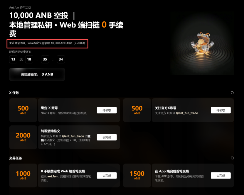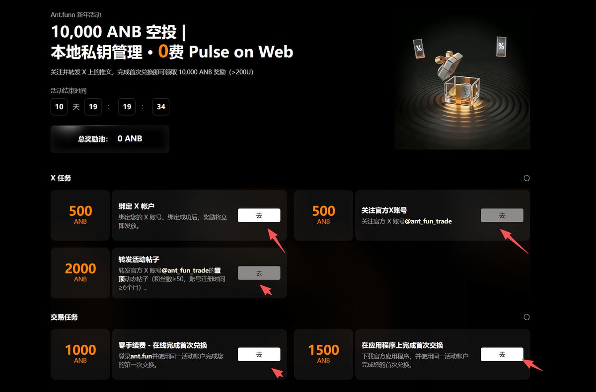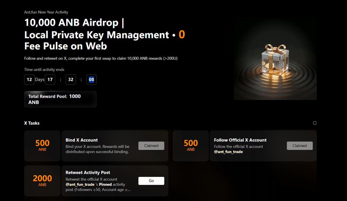 这两天刷到 https://t.co/SVb9I7NyX1 的新年活动,我自己去翻了下规则,感觉还算“讲道理”,所以顺手分享给想找点新机会的朋友。 先说人话版结论: 它不是那种靠抽奖、靠运气、靠你刷到手抽筋的活动,而是把“做什么—拿多少”写得挺清楚。完成社交任务 + 做交易,就能逐步解锁奖励,单个账号最高能到 10,000 枚 $ANB ,大概 200U 的上限,至少不会让你猜来猜去。 活动页面:https://t.co/IXNbYjGUYC 我觉得它比较加分的点在这几块: 1)钱包自托管 平台不拿你的私钥,你的钱包你自己管,这种模式我个人更放心。 2)Web 端 0 手续费 这个真挺实在,尤其是平时偶尔扫链、低频交易的人,成本少一点,体验就完全不一样。很多项目嘴上说“友好”,一看手续费就劝退。 3)操作逻辑比较直 任务就是绑定 X、关注 @ant_fun_trade、转发相关内容、做首笔真实交易,再加邀请任务(想冲更高奖励就拉人,不想拉也能做基础部分)。整体流程对新手也不算难。 如果你平时就喜欢玩链上热点、或者最近正好想找个活动练练手,我觉得 https://t.co/SVb9I7NyX1 这波可以列进“值得看一眼”的清单里。 别把它当玄学撸毛,就按规则来,做完该做的,能拿多少就拿多少,挺适合这种风格的活动。