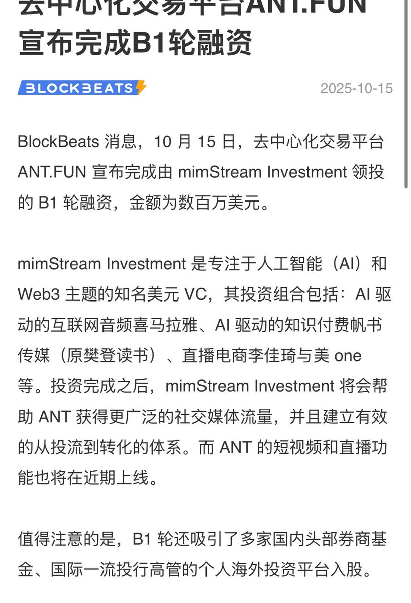 兄弟们,这个可以撸,我也在撸。大家可以试试 0成本撸毛,大号级别,大概每人 200U 玩链上 meme 的可以关注下这个机会: Solana 生态的 Social DEX 项目 @ant_fun_trade 正在做官方免手续费活动, 0撸 + 交易 + 邀请,还可以做邀请。完成就能拿 $ANB 奖励 💰 奖励情况 •$ANB 现价约 0.0199U •单人最高可领 10,000 ANB •理论价值 ≈200U 🚀 操作流程 1️⃣ 打开链接,连接 Solana 钱包👉 活动页面:https://t.co/1Pb8oqTnAI 2️⃣ 创建本地钱包,助记词务必保存 3️⃣ 完成社交任务,直接拿 1000 ANB(≈20U) 4️⃣ 完成首笔交易,继续解锁奖励 5️⃣ 邀请好友,奖励叠加 📌 关于 https://t.co/GbggWW1XbH https://t.co/GbggWW1XbH 是一个去中心化交易平台, 未来将拓展短视频、直播等社交内容, 目标打造 交易 + 社交 + 内容 一体化生态, 并持有 RIA & STO 牌照。 在 10月15日,https://t.co/GbggWW1XbH 完成数百万美元的 B1 轮融资,由 mimStream Investment 领投,后者专注AI和Web3。融资后,https://t.co/GbggWW1XbH 将上线短视频和直播功能,并获得更多社交媒体流量支持。 能白撸就别犹豫,冲起来,去试试