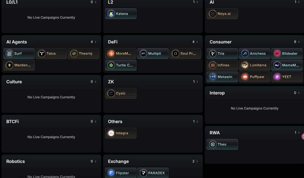 每次看到别人晒「0 本金撸了几千刀」的帖子,我都冷笑:是的,我酸了。 于是我开始认真研究这个叫 @KaitoAI 的平台。它不需要你梭哈,只需要你去“交互、写帖、做任务”,项目还没发币就能拿积分。 有人已经靠这玩意上了几个冷启动项目的白名单,还被项目方拉进“inner circle”。 我悟了。这不是任务平台,这是 “打工换币圈本金”的地方 于是,我整理了 11 月份最值得参与的 Pre-TGE 项目榜单:L2、AI、DeFi、游戏、RWA,全部覆盖。 【L2 赛道】 ① @katana Katana 是一条高性能 L2,核心卖点是“模块化 Rollup 工具包”,类似 Aevo+Scroll 的混合体,项目方想做「一键发 Rollup」。 👉 已开放测试网、可领 OG Badge。 交互奖励:早期交互用户会计入积分计划(Katana Points),据说会映射 TGE 空投。 ② @wardenprotocol 俗称“典狱长协议”,一条意图型区块链。你发一句命令(比如“余额<100自动补仓”),系统自己执行。 👉 目前在选 500 名「亿万典狱长」角色,有空投池。 交互奖励:活动白名单 + 空投抽奖。 ③ @Talus_Labs Talus 是 AI Agent 基础设施,和 @SentientAGI 合作紧密,主打「去中心化智能体经济」。 👉 可注册测试账号、构建 Agent。 奖励:测试积分 + 生态空投资格。 ④ @NetworkNoya 做的是 AI 推理与数据验证层,让链上 AI 任务有可验证结果。 👉 可跑节点/测试推理任务。 奖励:早期贡献积分 + 节点质押空投。 ⑤ @Surf_Copilot AI 交易助理,一句话生成交易策略(Prompt-to-Trade)。 👉 加入候补名单、体验 Demo。 奖励:Beta Pass + 空投预留位。 【DeFi 赛道】 ⑥ @moremarketsxyz 去中心化衍生品平台,想做“链上 Bloomberg”。 👉 正在积分测试阶段。 奖励:MPoints 可兑换 $MORE 空投。 ⑦ @0xSoulProtocol Soul 是 DeFi + 社交融合的多链协议,主打可编程钱包 + 挖矿自动化。 👉 开放 Beta,任务较简单。 奖励:Soul Score 排名前 1k 空投资格。 ⑧ @multiplifi 杠杆收益聚合器,一键放大收益,支持 GMX、Aave、Pendle。 👉 测试活动活跃。 奖励:Early Tester + Mult Points。 【Consumer / 娱乐 / 游戏】 ⑨ @useTria AI 数字身份管理,能统一你的 Web3 登录、数据和信用。 👉 填表 + 提交邮箱注册。 奖励:OG NFT + 积分系统空投。 ⑩ @AnichessGame Animoca 支持的「策略 + 对战」游戏,带 AI 解谜系统。 👉 注册 + 玩几局游戏。 奖励:棋盘 NFT + $ANI 空投优先。 ⑪ @bitdealernet iGaming × RWA 平台,把博彩资产变成 Meme 代币。 👉 Kaito 排行前 200 每周有 XP 奖励。 奖励:XP → TGE 兑换 $BIT + 每周额外空投。 ⑫ @infinex 是 Synthetix 创始人 Kane 的新作,非托管 CEX,主打「无钱包体验」。 👉 预注册中。 奖励:早鸟名单 + 贡献积分。 ⑬ @MemeMax_Fi Perp DEX + Meme 平台,活动规则是「发帖即挖矿」。 👉 发推/评论/上榜。 奖励:200 万美金池,每月前 500 名瓜分 $M。 ⑭ @LumiterraGame 开放世界 Web3 RPG,近似链上版原神。 👉 注册 + 完成任务。 奖励:Beta Pass + NFT 奖励 + 后续空投。 ⑮ @MetaWin 做链上抽奖 + LuckyFi,玩法轻交互。 👉 免费参加抽奖活动。 奖励:积分 + $META 抽奖资格。 ⑯ @yeet 社交分发平台,有点像加密版 TikTok。 👉 注册、发内容。 奖励:YEET Points,可转化空投。 ⚙️【Others / Infra】 ⑰ @integra_layer 多链数据互通层,让 Rollup 共享状态。 👉 测试任务活跃。 奖励:积分系统 + TGE 空投预留。 💱【Exchange】 ⑱ @flipster_io 合约交易平台(有 CEX 体验的 DeFi),最近推 Referral 奖励。 👉 注册 + 开单。 奖励:交易 XP + 推荐返现 + 空投积分。 ⑲ @paradex Arbitrum 上的链上合约交易平台,由 StarkEx 支撑。 👉 钱包绑定 + 模拟交易。 奖励:Trading XP + Early Trader NFT。 【RWA】 ⑳ @Theo_Network 链上美债协议,把 T-Bills 代币化($thBill)。 👉 可以在 Pendle/Euler 等平台参与锁仓。 奖励:收益 + 积分 + 潜在空投。