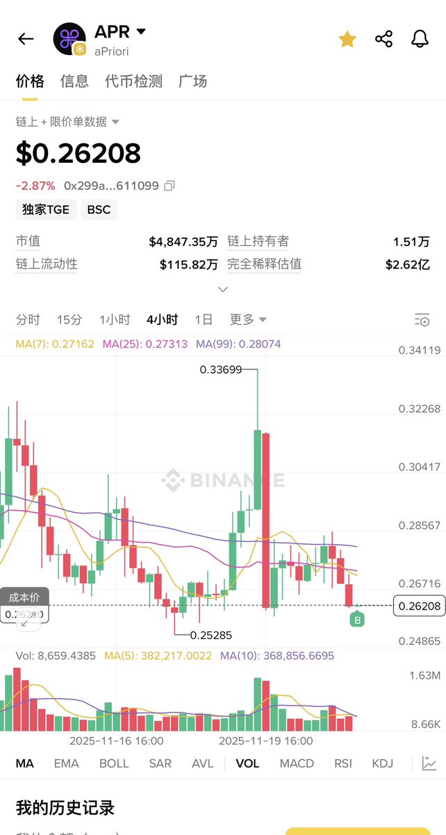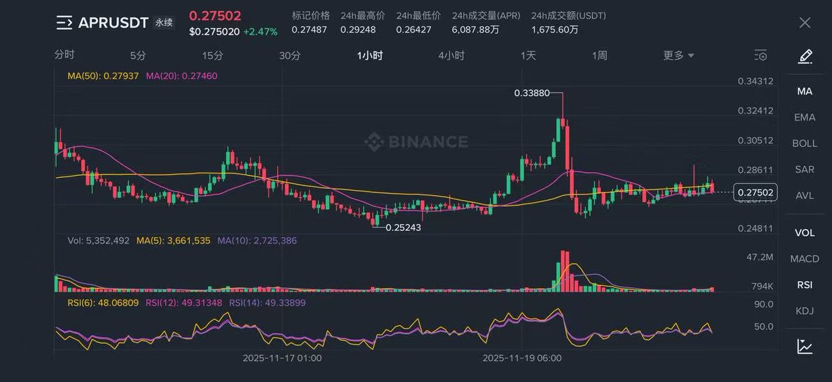 $APR 已拿到 Yzi Labs 投资,也上了币安 Alpha 和多家中型交易所,热度不低。现在的 0.28 不是一个随便能横盘的位置,技术上有预期,消息面有催化,情绪上又在累积。简单说:APR 现在处在“要么不动,一动就大”的区间,盯紧就对了