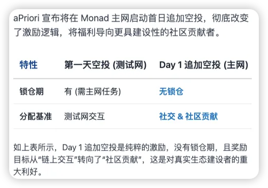 作为空投的补救措施,aPriori 已大幅降低在 Monad 主网上解锁空投额度的要求,让那些真正愿意陪伴项目到 Monad 主网上线的用户,能够拿到他们的奖励。这种松绑,本质上是对真实留存用户的最大尊重。除了修补第一波的规则,aPriori 还打出了一张“明牌”——确认将在 Monad 主网上线后,启动面向纯 Monad 社区的第二波空投及生态激励。