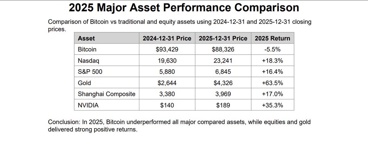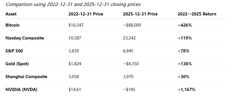 情绪的低迷往往会带来悲观的思考,但不得不承认的事实是,在整个2023---2025这三年的牛市周期中,AI取代了WEB3成为了全球资本市场里最性感的叙事;在2025年加密货币龙头比特币更是跑输了大多数的热门投资标的,让AI帮我跑了个表格如下: