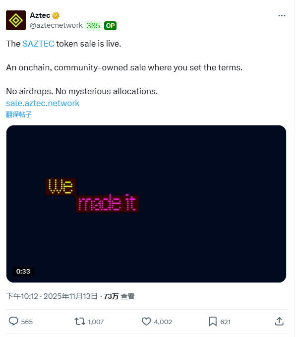 🔵 @aztecnetwork 启动 $AZTEC 代币公开拍卖