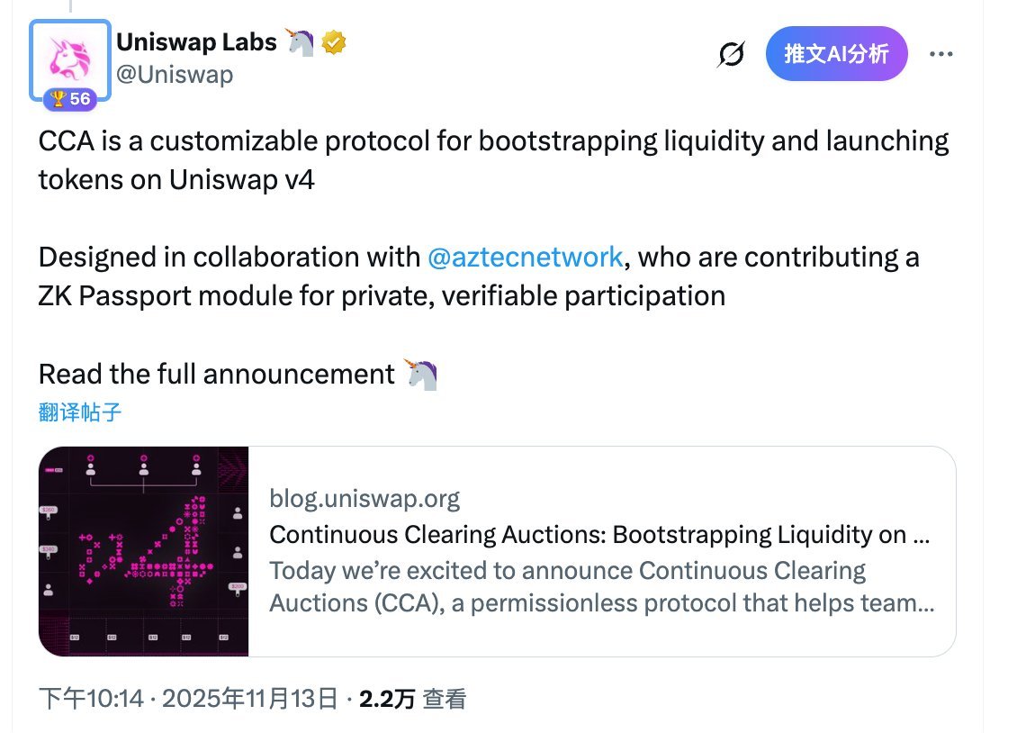 $UNI Uniswap 推出持续清算拍卖CCA,用来帮助项目方在 Uniswap v4 上启动并引导流动性,同时完成对新代币或低流动性代币的公平价格发现。