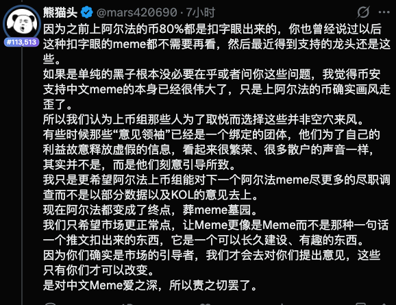 昨天第一次看一姐动了真怒,长篇幅怼一个关于meme和上币组的批评。 我觉得怼的不冤,最近其实上币组的审美很在线啊,尤其昨天上的两个Alpha,跟被大家诟病已久的“二圣”没一点关系。 $1 是推特上推文最爆的文章,上亿的阅读,musk转发2次,推特上无论中文外文一堆官方号跟风模仿图片风格,就不是meme什么是? $哭哭马 是有抖音热度,中文Ticker里算是破圈的,还有老外大佬(Bome)发图二创。虽然我没赚到这个钱但逻辑能理解,比什么山野之类的更应该被选中。 在我看来Alpha最大的问题是没有持续的财富效应,之前的人生K线等都是热极一时然后就谢了,敢去二波的都埋了,因为99%都没强庄,纯散户情绪fomo一下结束。 市场流动性不好的时候fomo完往下跌这是常态,看看对面Solana的meme,BSC这边真算好了,那边跌起来都是直接归零走的,BSC的明显慢很多。而且我也说了不少次,BSC你跌了还能用你的母语找到骂的人,一姐还会响应,会表达态度。 Sol那边你连骂谁都不知道,骂了也没人搭理你,不信试试去骂 @a1lon9 看看? 当然也不能一桌子菜都是没强庄的,这时候也要来点有强庄的搭配下口味。这是为啥之前USD1 比赛开始后我支持 $安 和 $BIGDON 的原因,去年比赛时候几个强庄meme币是撑起了BSC meme半边天的,很长一段时间内持续有赚钱效应。 昨天不少人提前埋伏Alpha没给暴跌跑了一波,但能看到明显有护盘和支撑,换别的估计直接没了。 各种类型的meme都有点才好玩,大家博弈的是不同的点和玩法,至少现在的BSC我觉得比Solana更有玩的动力,知足吧。