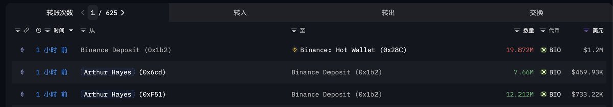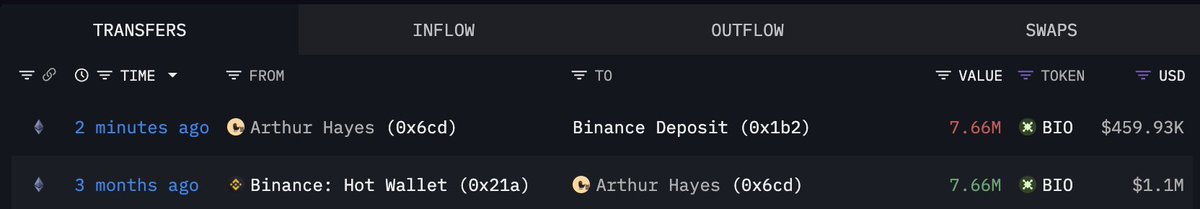 Arthur Hayes(@CryptoHayes) just deposited 7.66M $BIO($460K) to #Binance.