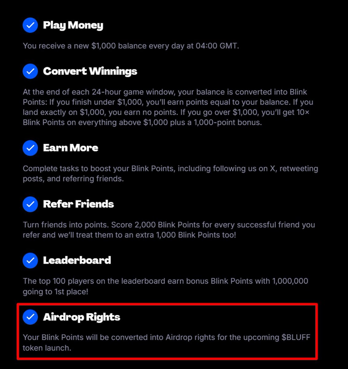 You can earn ‘Blink Points’ which = $BLUFF as an airdrop. Players can earn $1000 a day in rewards