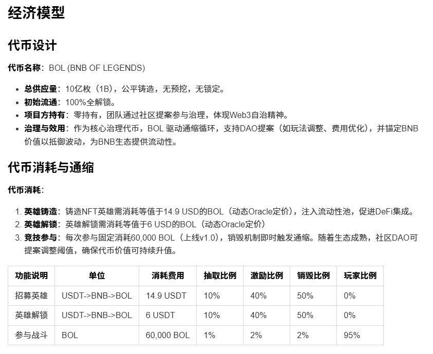 它是标准的公平启动模型:总量 10 亿、100% 流通、没有预挖、没有团队仓,项目方理论上没有先天的砸盘筹码。更关键的是它的通缩不是靠锁仓,而是靠真实消耗:Mint 英雄、合成升级、技能解锁、打 Raid 副本,全部都会销毁 $BOL 。