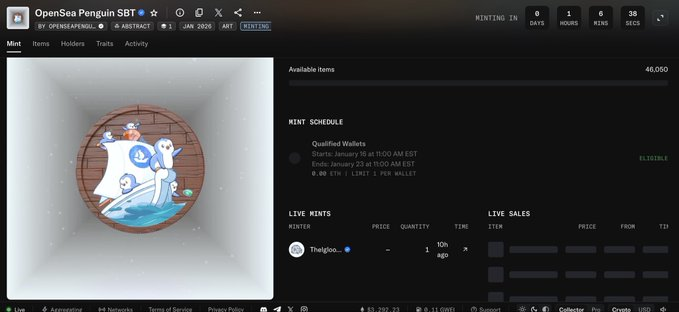 OpenSea @opensea 联合 @pudgypenguins 出了一个sbt,这次5级及以上的额外给一个,企鹅SBT总量46050 张,大家可以去查看下有没有铸造资格