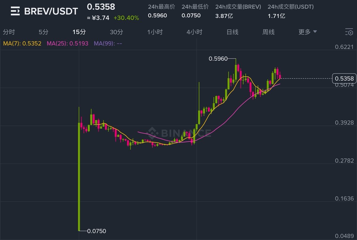 币安历经一个月终于上新现货新币,从上所到现在表现的非常强进。 $BREV 目前交易价格为 $0.5207 流通供应量为25亿/100亿,市值达1.31亿美元。 24小时交易量达6.96亿美元(超过市值的5倍),证实了激进的零售资金轮动。 此次上涨由 Binance(现货、保证金、期货及赚币)、OKX、Gateio、Upbit 和 Bithumb 的重大上架所推动,加上Binance持有者空投以及韩元交易对带动了韩国主导的需求。 多交易所流动性以及ZK基础设施叙事推动了价格上涨,作为ZK实用化关键突破,长期价值可期。 @binancezh @brevis_zk #HODLer #Binance